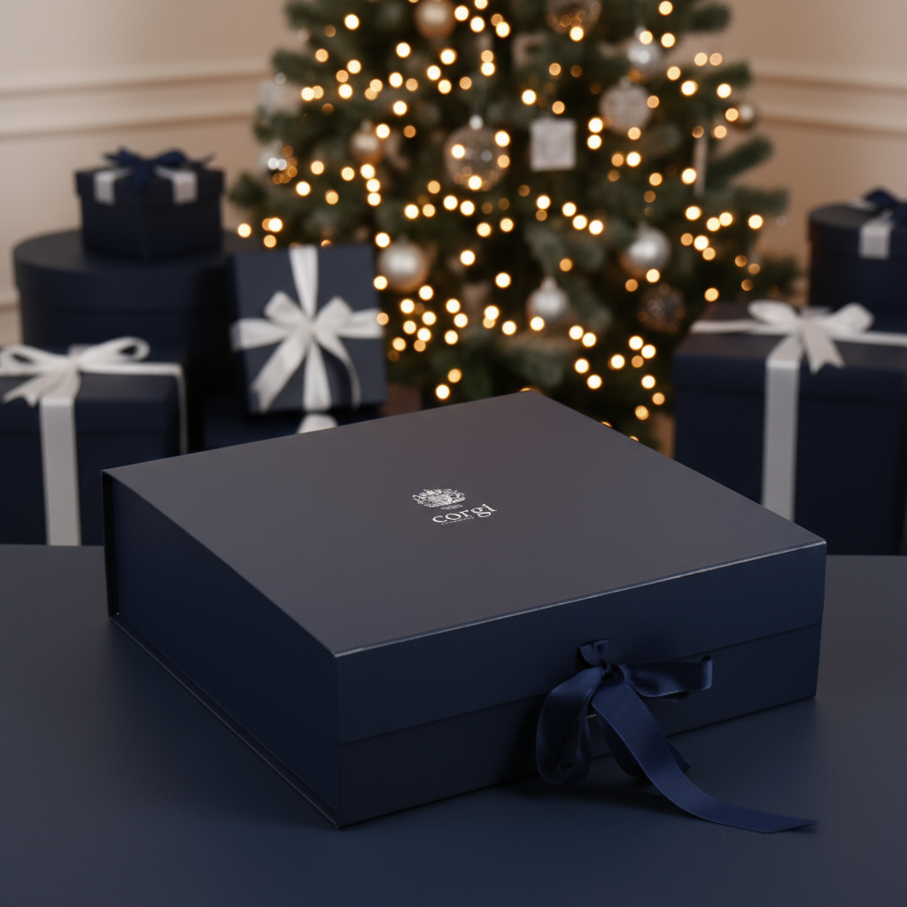 Wrap your Corgi knitwear in style with this elegant large gift box. Crafted from thick, durable cardboard, it features a magnetic lid closure with a satin ribbon fastening for a refined, secure finish. Designed in Corgi’s signature navy and detailed with a metallic silver logo, it offers a luxurious presentation for your most substantial pieces.