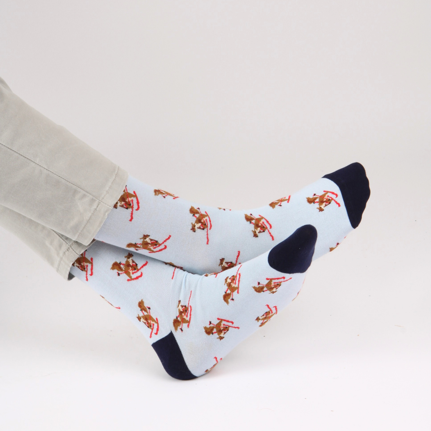Our Men’s Lightweight Cotton Skiing Squirrels Socks feature a charming all-over pattern of adventurous squirrels hitting the slopes, set against a soft sky-blue background with smart navy heels and toes.