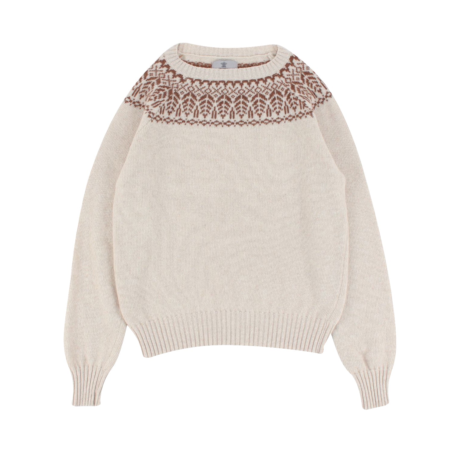 The sweater features a classic round neckline and a delicately patterned Fairisle yoke in contrasting tones, adding a touch of timeless Nordic style without overwhelming the refined simplicity of the piece. The lightweight 2-ply construction offers warmth without bulk, making it ideal for layering or wearing on its own indoors.